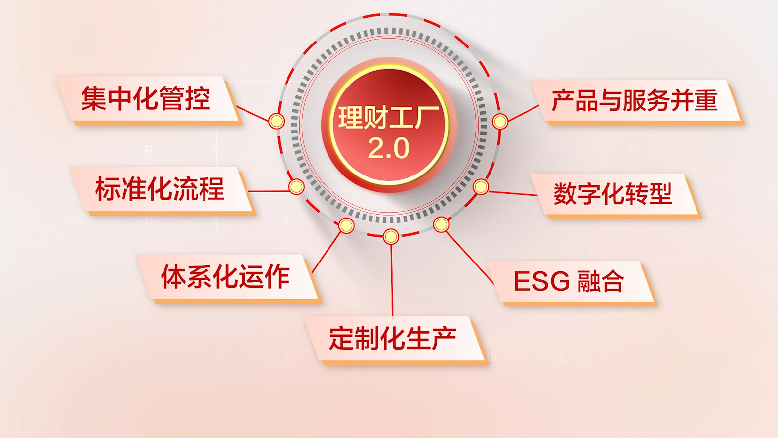 5年时间里,华夏理财完成了“理财工厂”从1.0版本向2.0版本的升级。1.0版本突出规模化生产、体系化运作、精细化管理、ESG融合、金融科技赋能五大特征;2.0版本则更加突出定制化生产、体系化运作、标准化流程、集中化管控、ESG融合、数字化转型、产品与服务并重七大特征。推动业务运行从“以我为中心”“以产品为中心”的供给驱动向“以客户为中心”“以渠道为中心”的需求驱动转变,加强对销售渠道的专业赋能和对终端客户的陪伴服务,以适应客户、市场和行业的新变化。