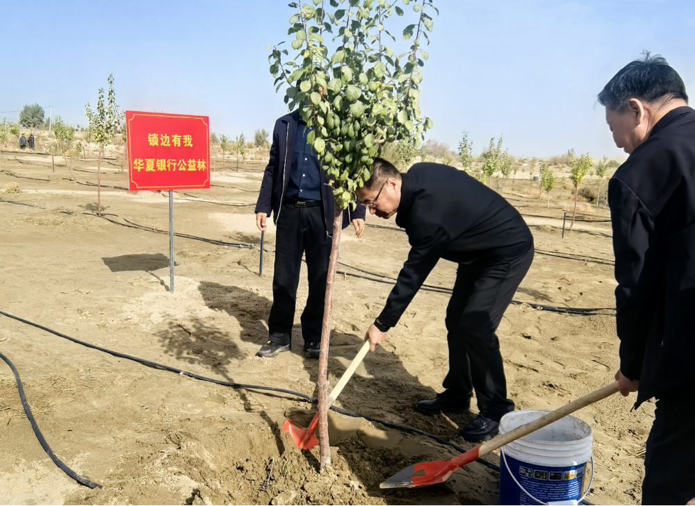 捐赠仪式后,华夏银行乌鲁木齐分行员工参与了公益治沙植树活动,与当地干部群众一同挥锹培土,栽种下一株株象征绿色希望的树苗。这一行动不仅体现了华夏银行对生态建设的重视,更展现了京疆两地同心协力、共建美好家园的决心。