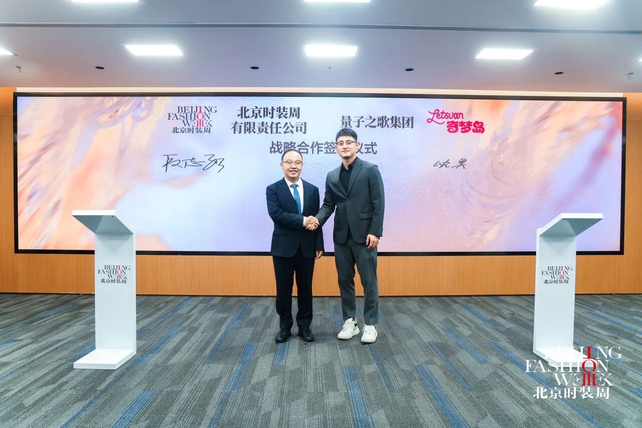 北京时尚控股有限责任公司董事会秘书、办公室主任、北京时装周有限责任公司执行董事段志强与量子之歌集团(奇梦岛)公共事务总经理沈昊共同进行战略合作签约