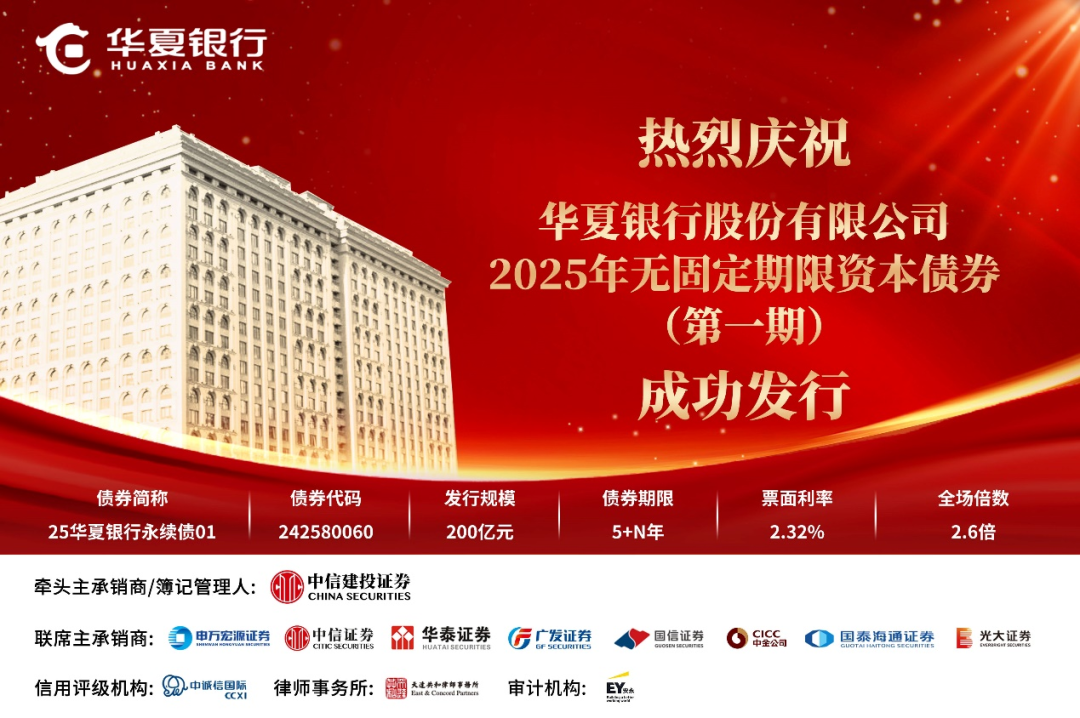11月28日-12月2日,华夏银行股份有限公司2025年无固定期限资本债券(第一期)成功发行。本期债券发行规模200亿元,票面利率2.32%。